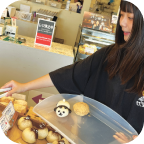 門真の新しいパン屋さん。オーナーの本田さんは門真市に40年以上住み、地域に還元できるものは何かを考え、人が集まる場所を提供したいとパン屋をオープンしたのだとか。「選ぶ楽しさを知ってほしい」とお手頃(130円)のパンは100種類以上。パンは粉から店内で作り、看板商品はきなこモチモチパンで、芋餡(いもあん)を使い素材一つ一つにもこだわっている。